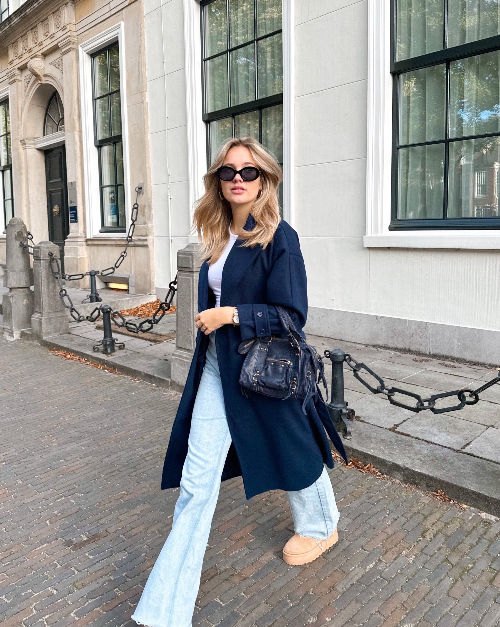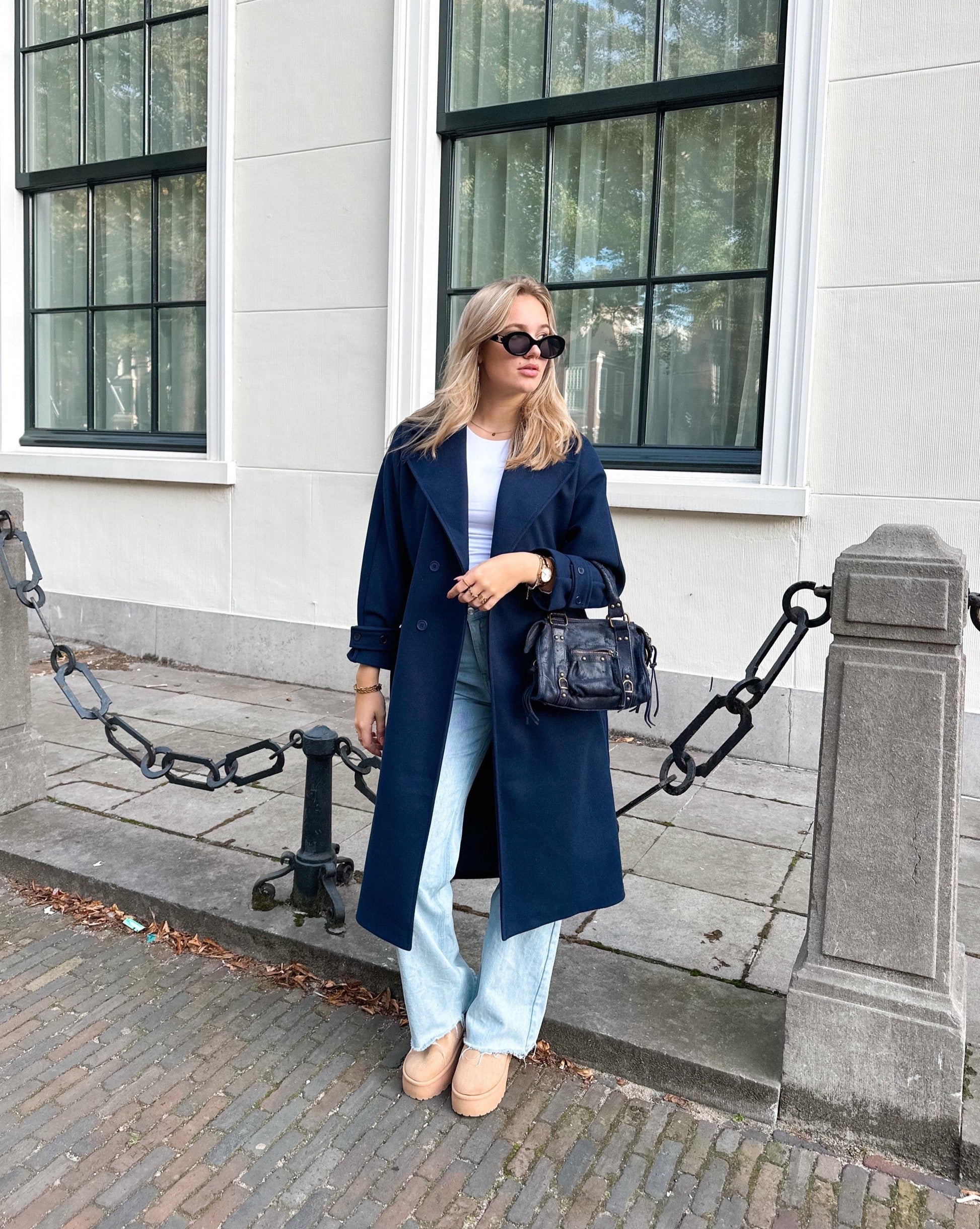 Double-Breasted Wool-Blend Coat with Notched Lapels and Belted Cuffs