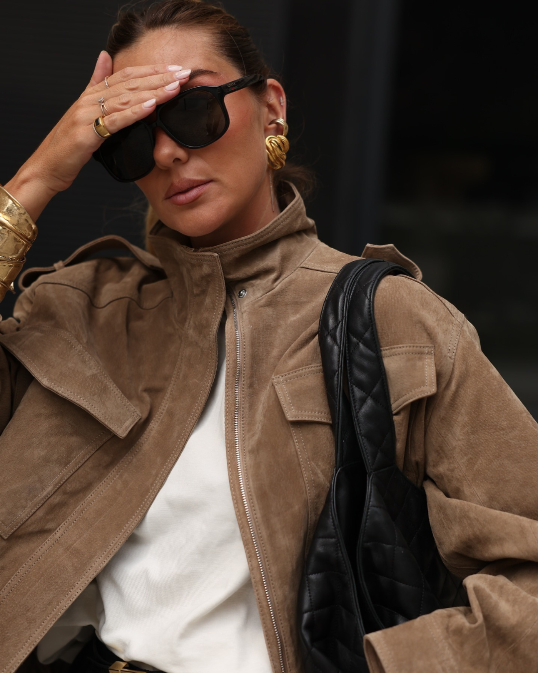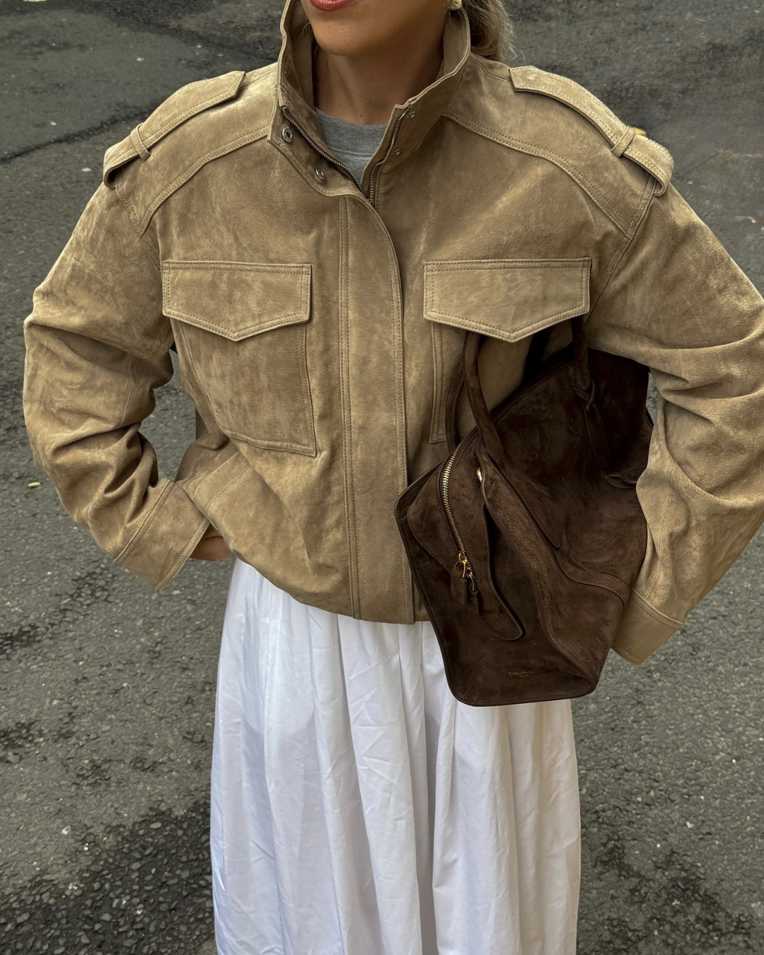This jacket has a front zip closure with a stand collar and long sleeves.