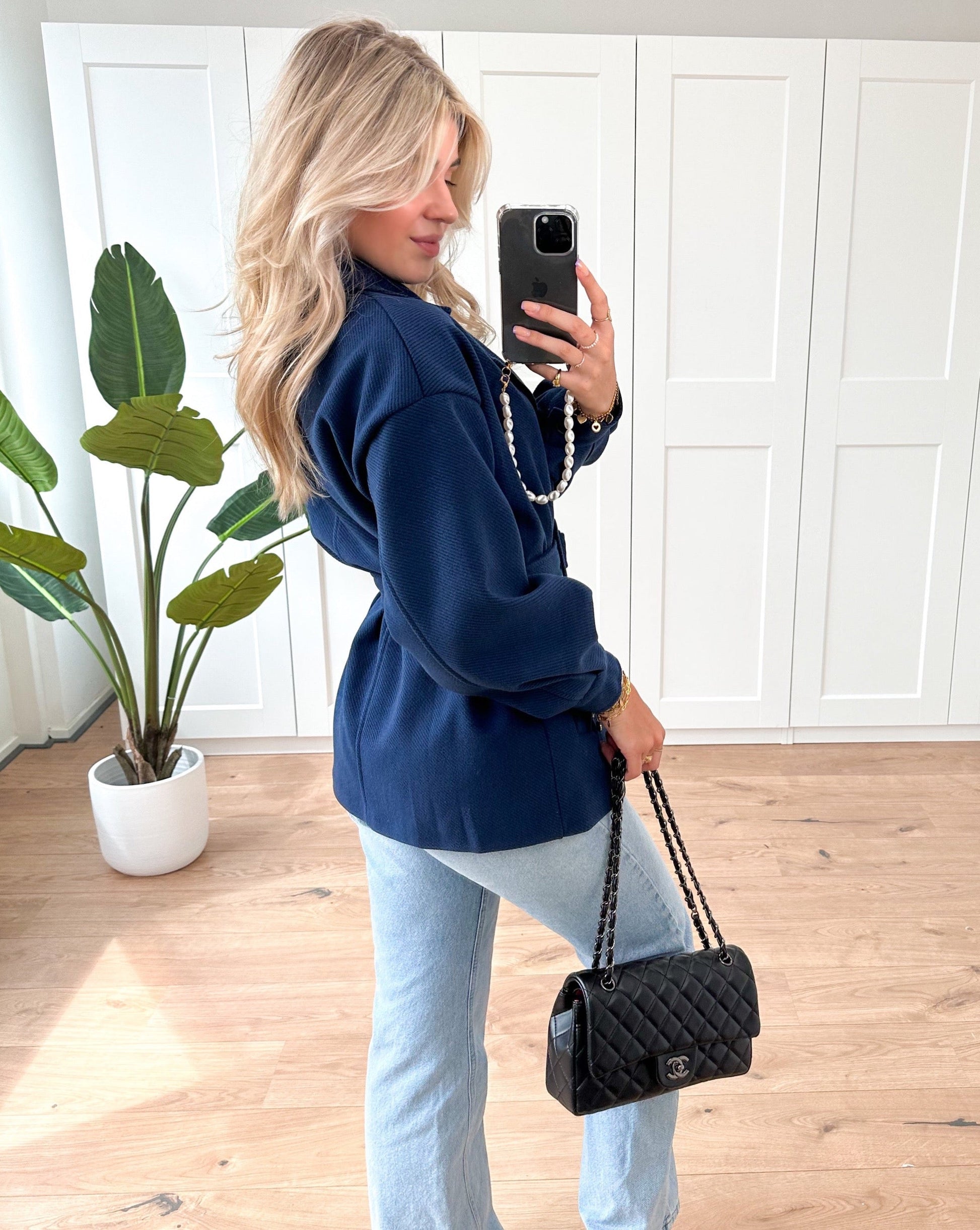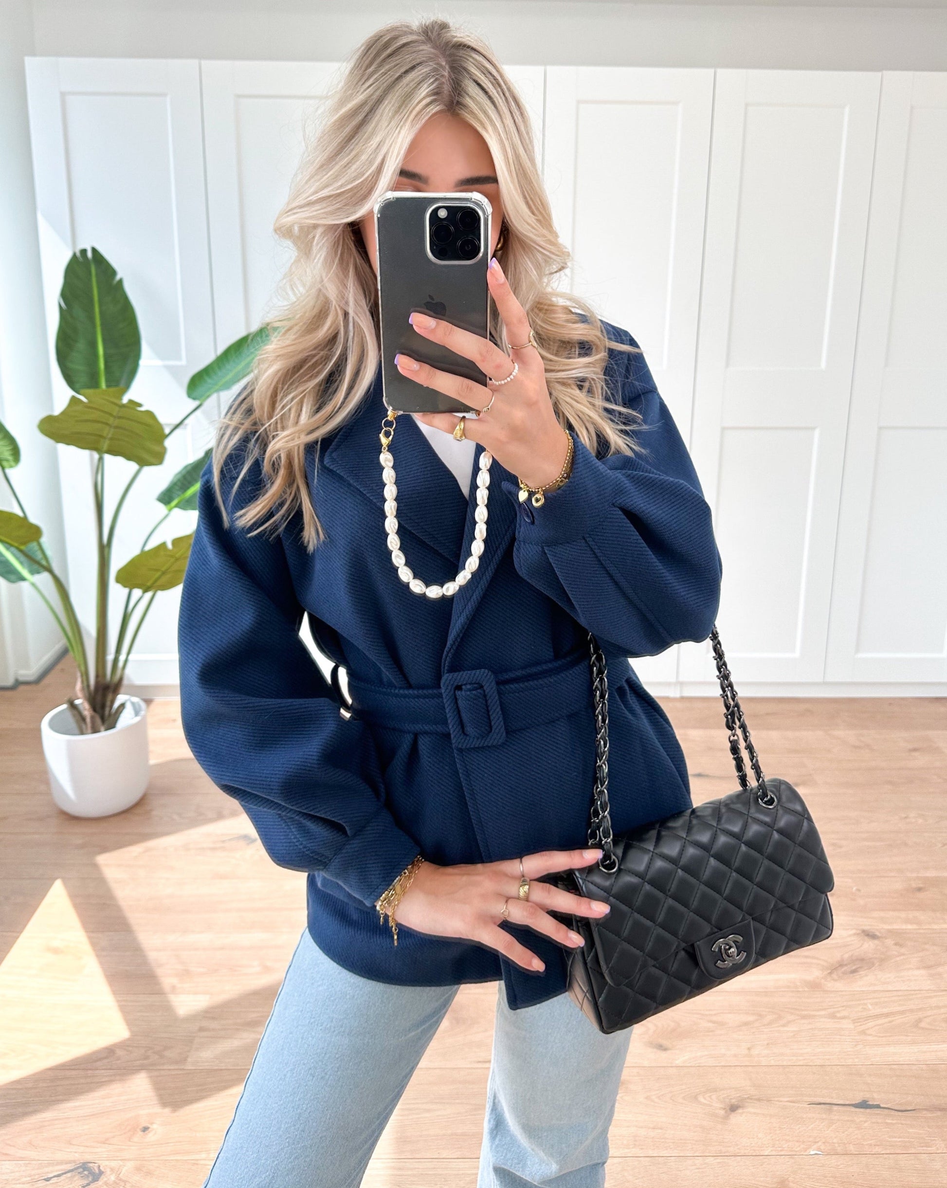 This jacket has a self-tie belt closure and long sleeves.